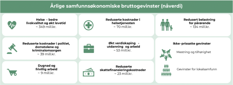 Den totale samfunnsgevinster er på hele 677 millioner kroner. Gatelagene bidrar både til å hjelpe mennesker med rusproblemer og bedre samfunnsøkonomien. Lagene gir folk en følelse av mestring og tilhørlighet, ved å møte opp på treninger og lage vennskap med sine lagkamerater. Det hjelper me å få en bede helse og livskvalitet som også er den delen med størst gevinst til samfunnsøkonomien. Det bidrar til å redusere kostnader i helsetjenesten, samt redusering av belastning for pårørende.